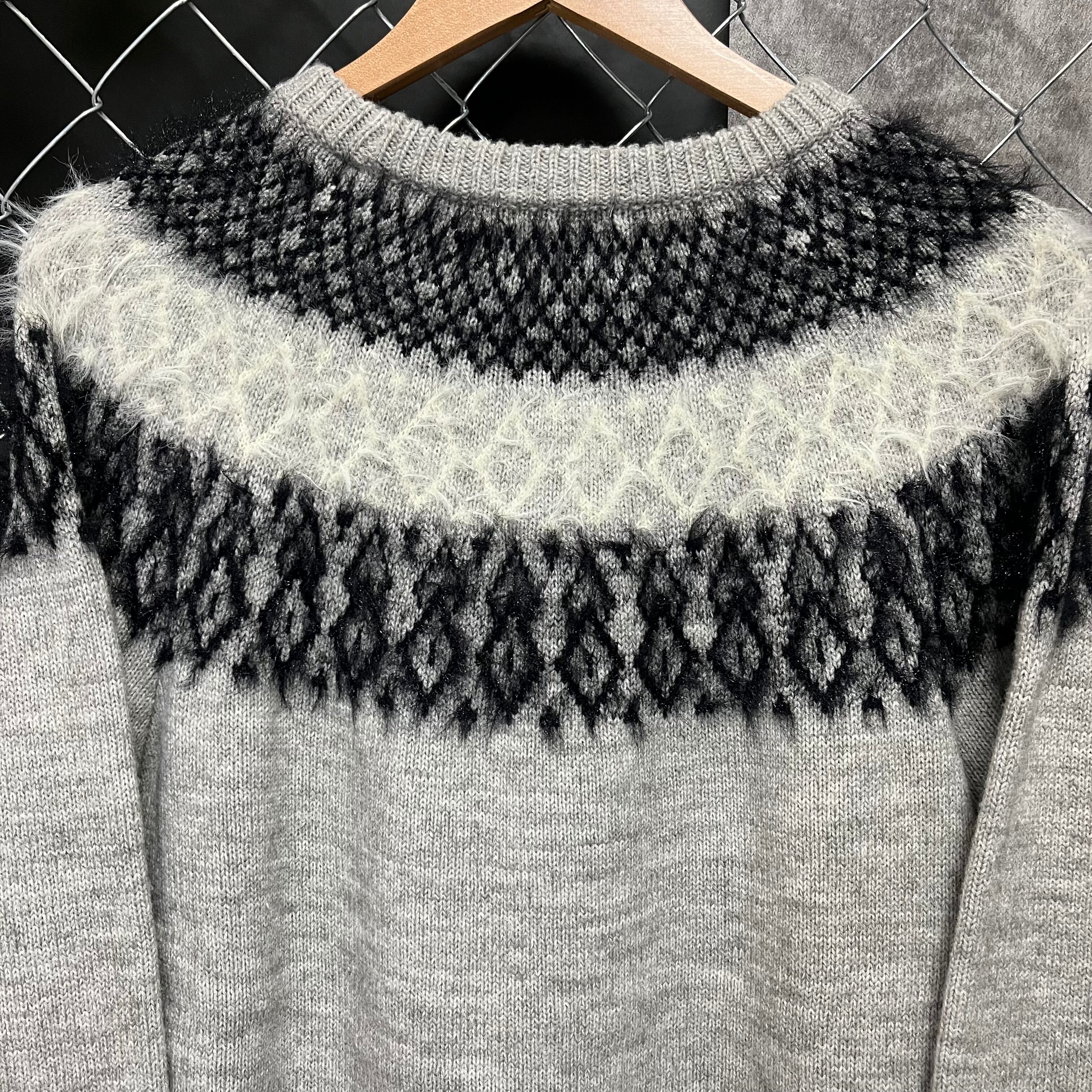 多少の使用感があります。ブラックとホワイトの柄部分の毛羽立ちがございます。日本語の洗濯表示がついていますので、洗濯する際の参考にしてください。ハンガーに掛けることによって型崩れする場合がございますので畳んで保管をお勧めします。