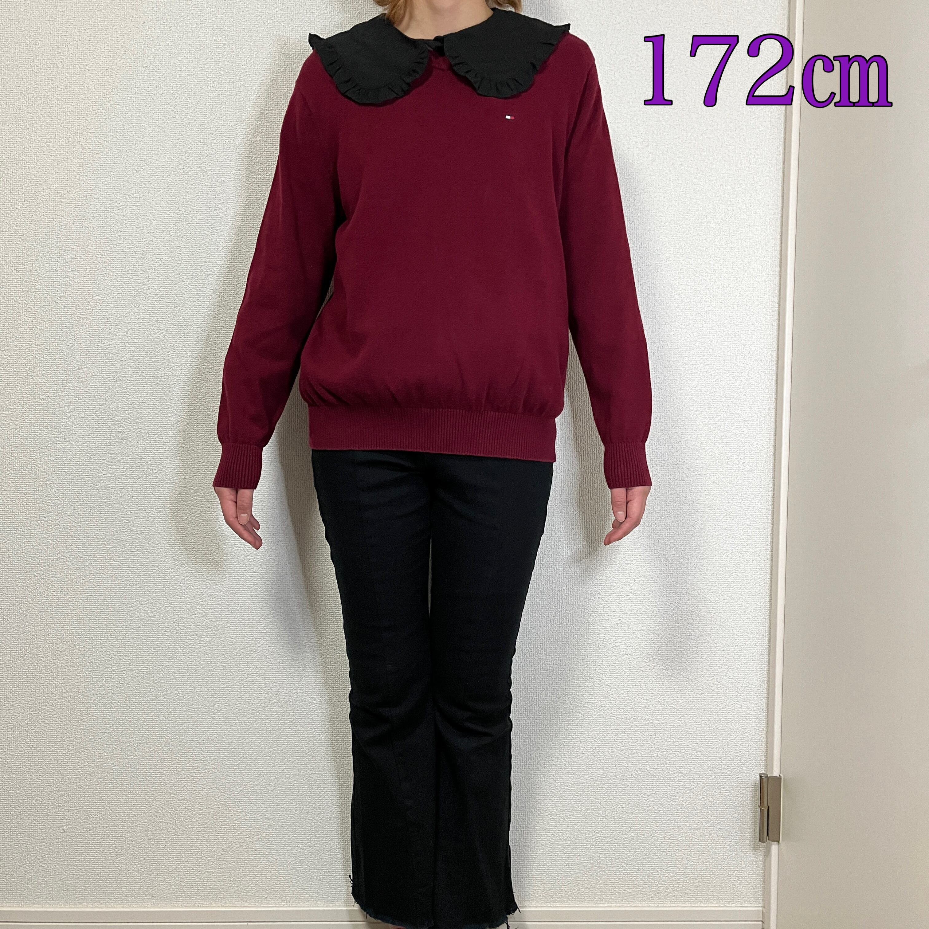 ワインレッドに近い色目でデニム、チノパン、白パンツ、黒パンツ、なんでも合わせやすく、着回し力抜群のアイテムです(❁´◡`❁)