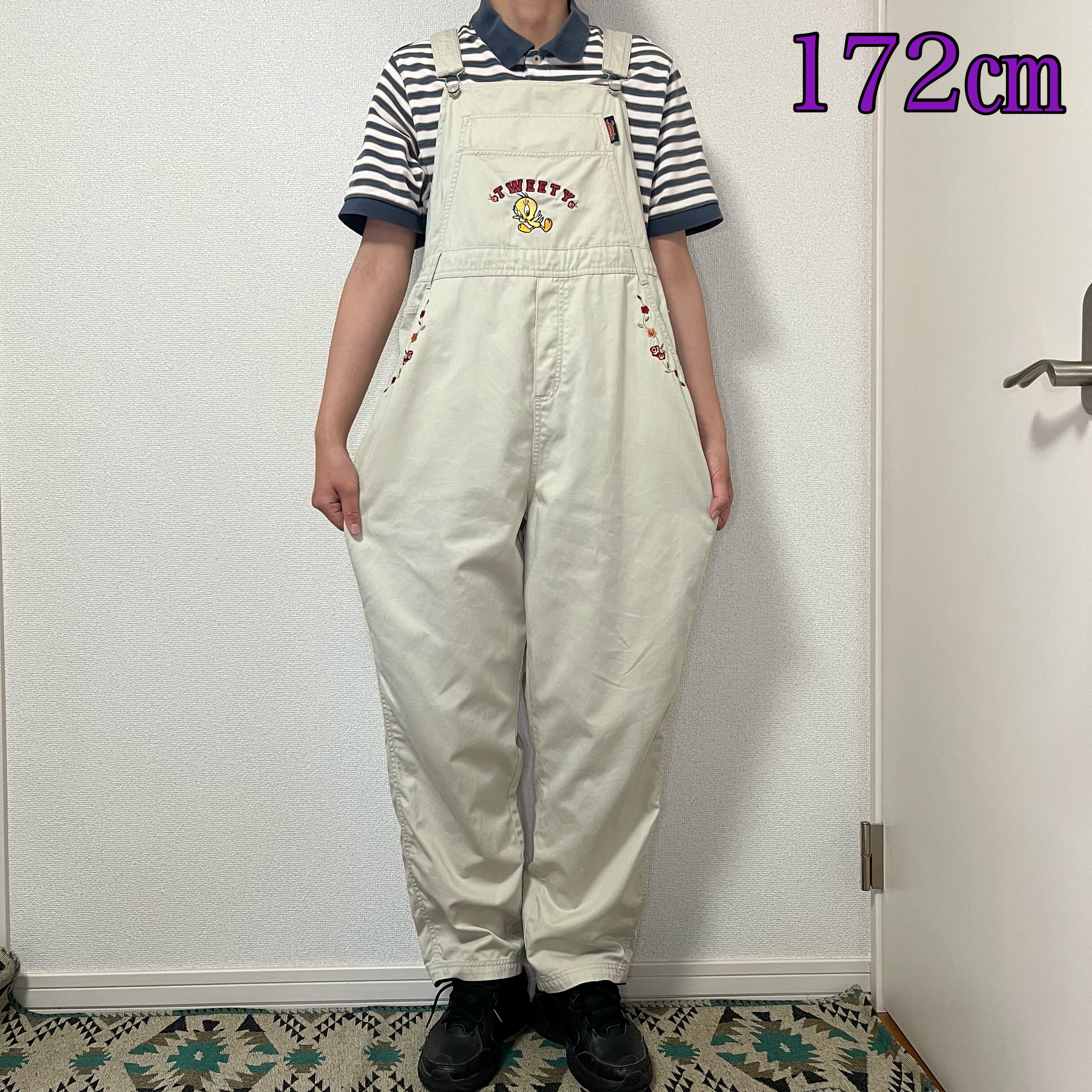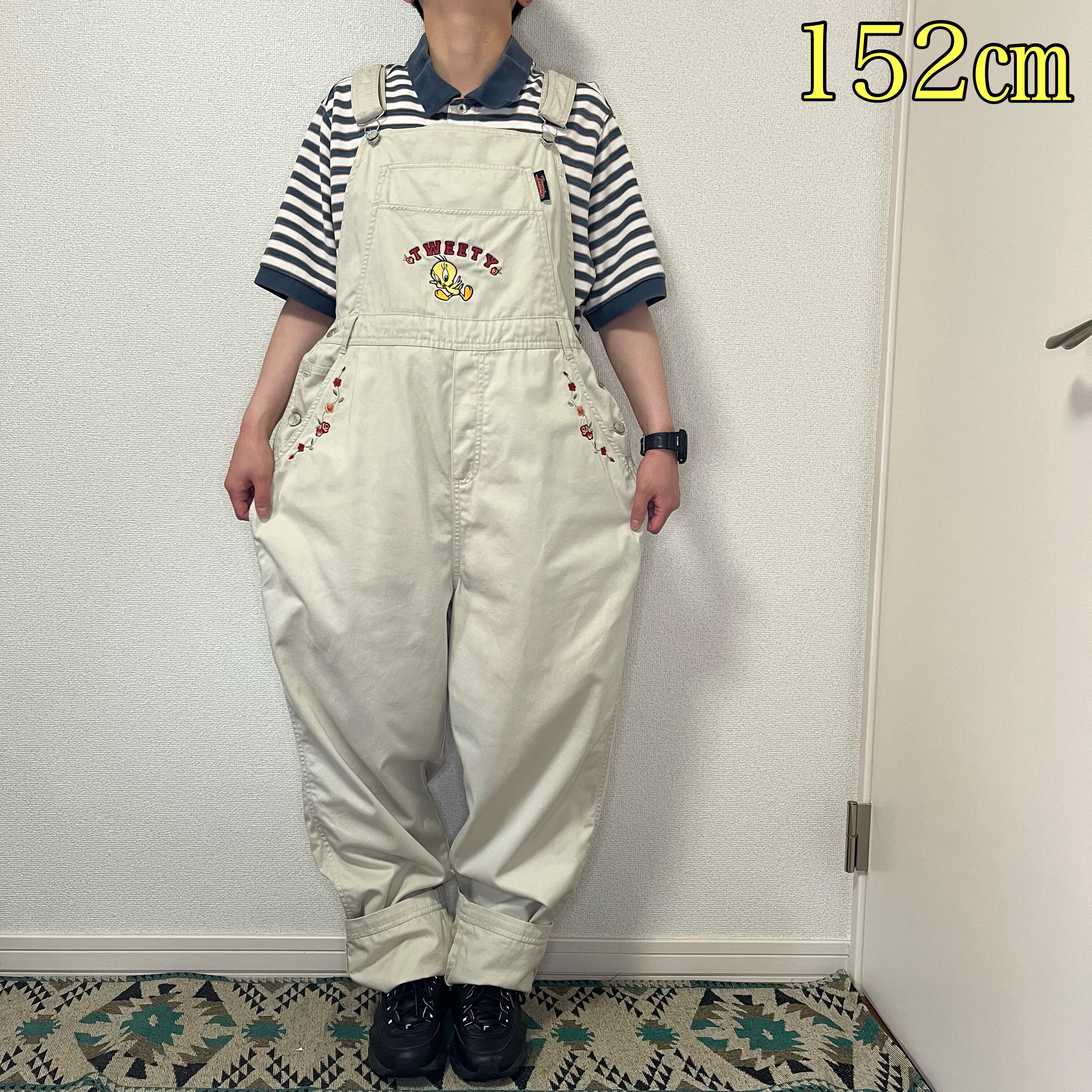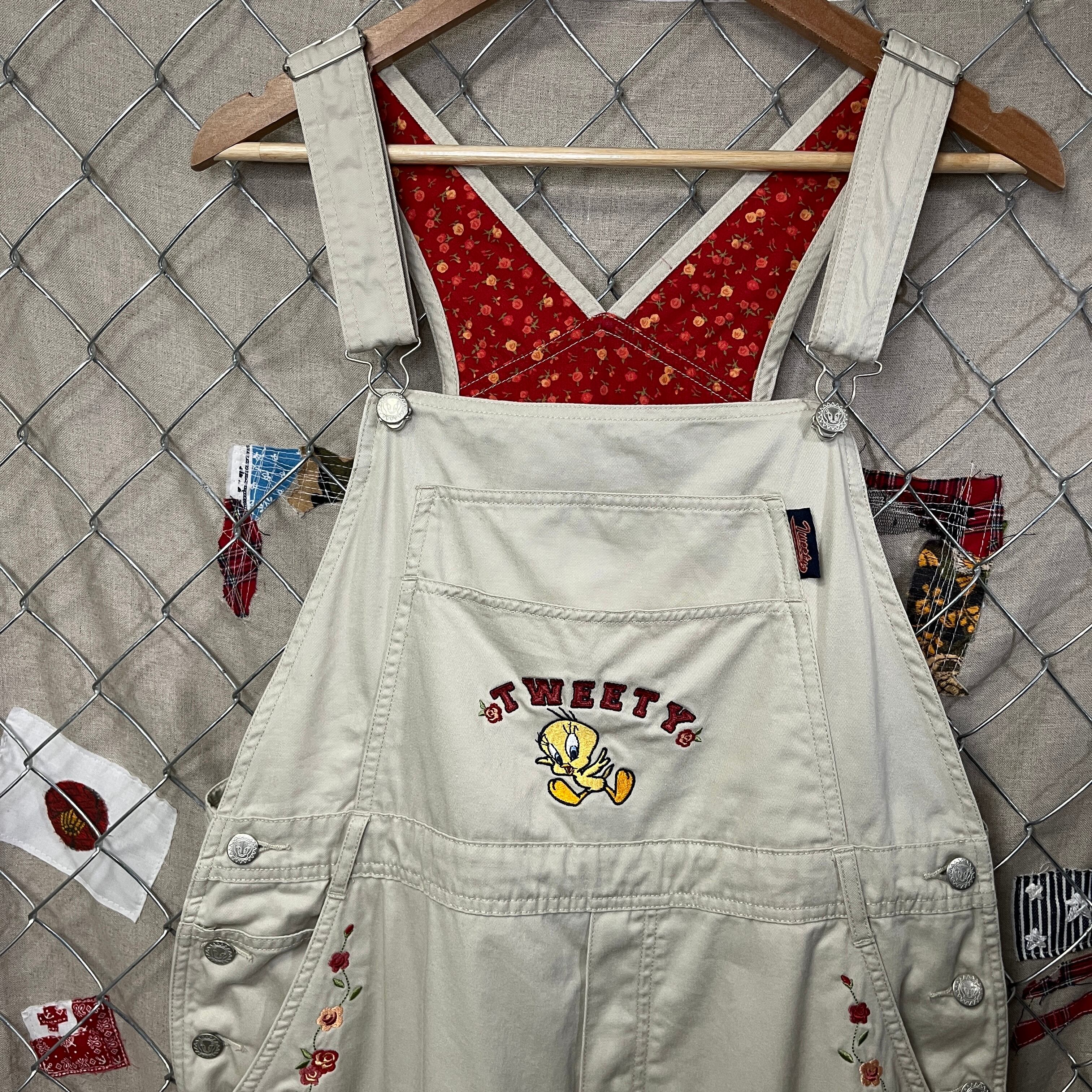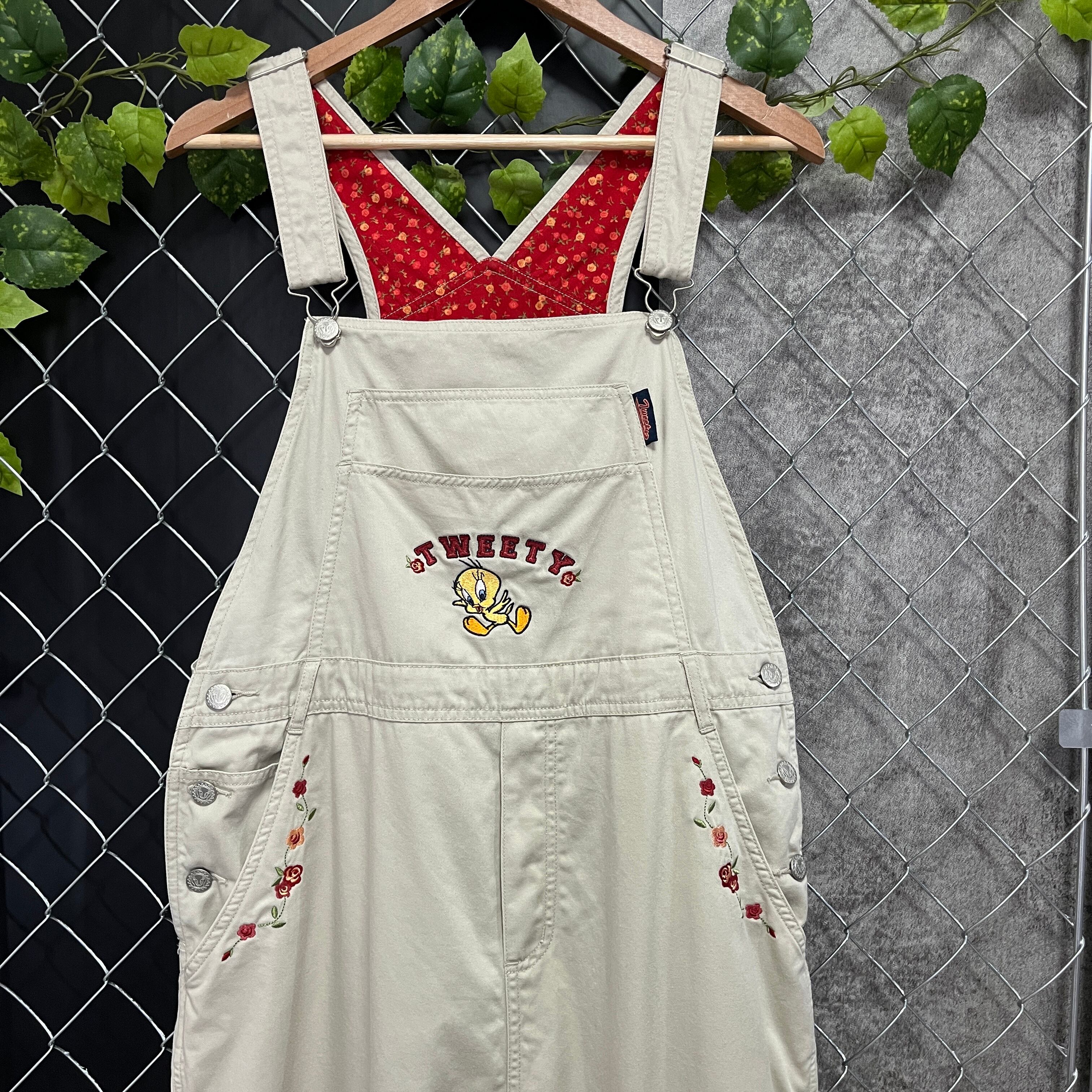 お腹のポケット部分にトゥイーティーの刺繍や腰ポケット部分にお花の刺繍がある可愛らしいデザインです☺︎