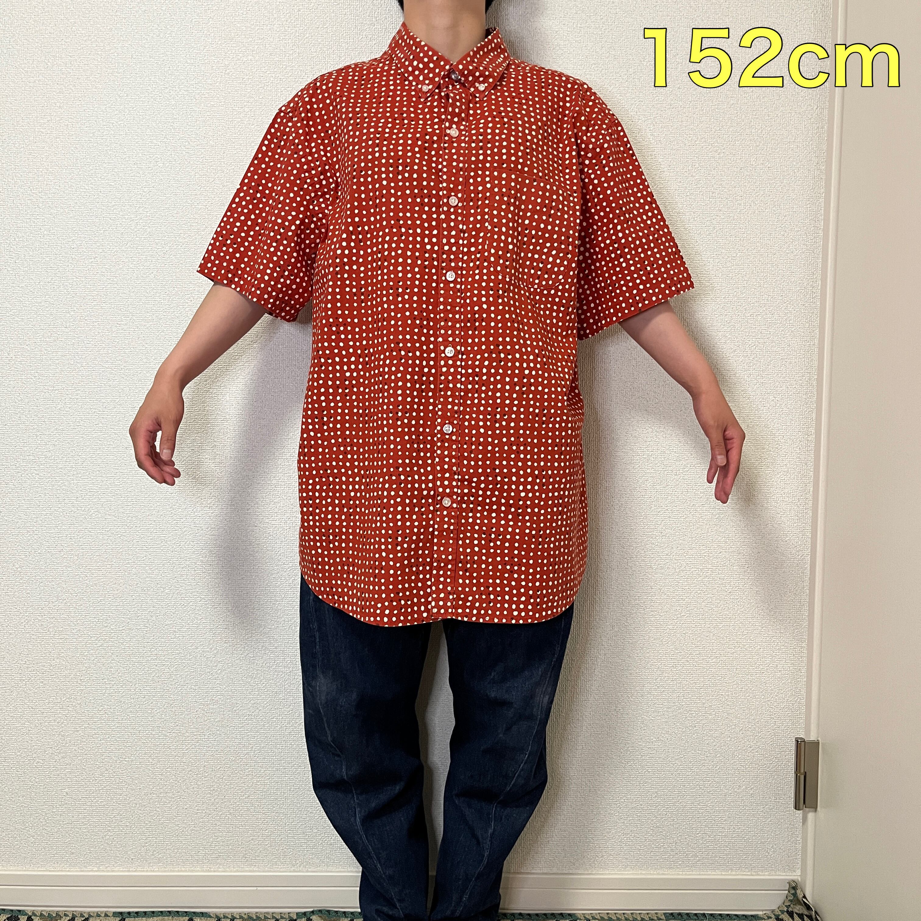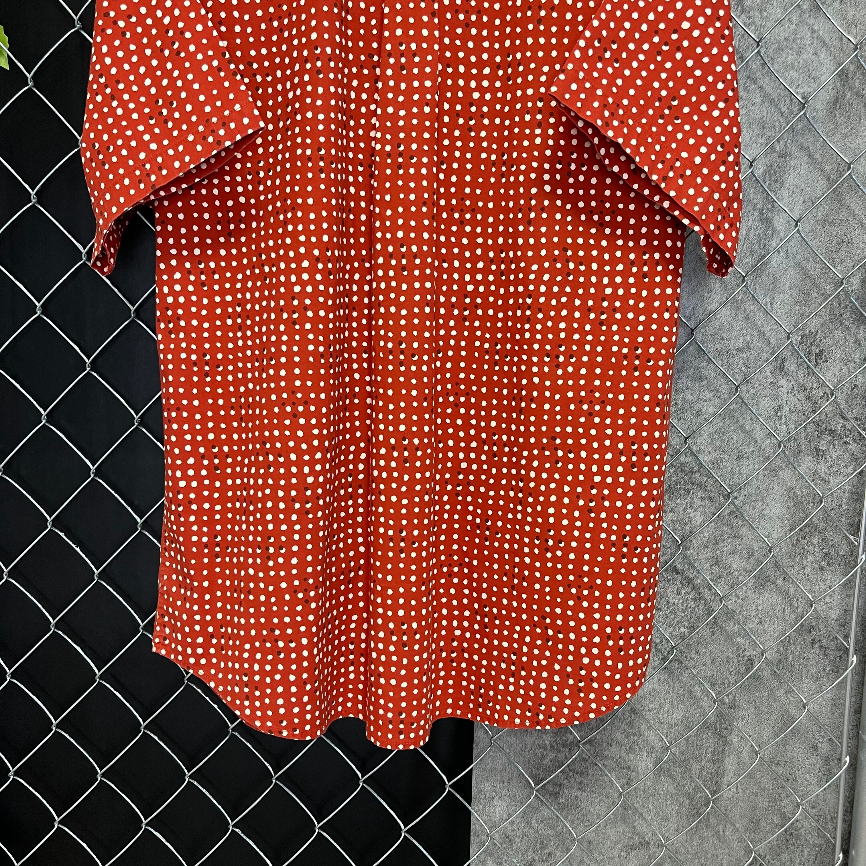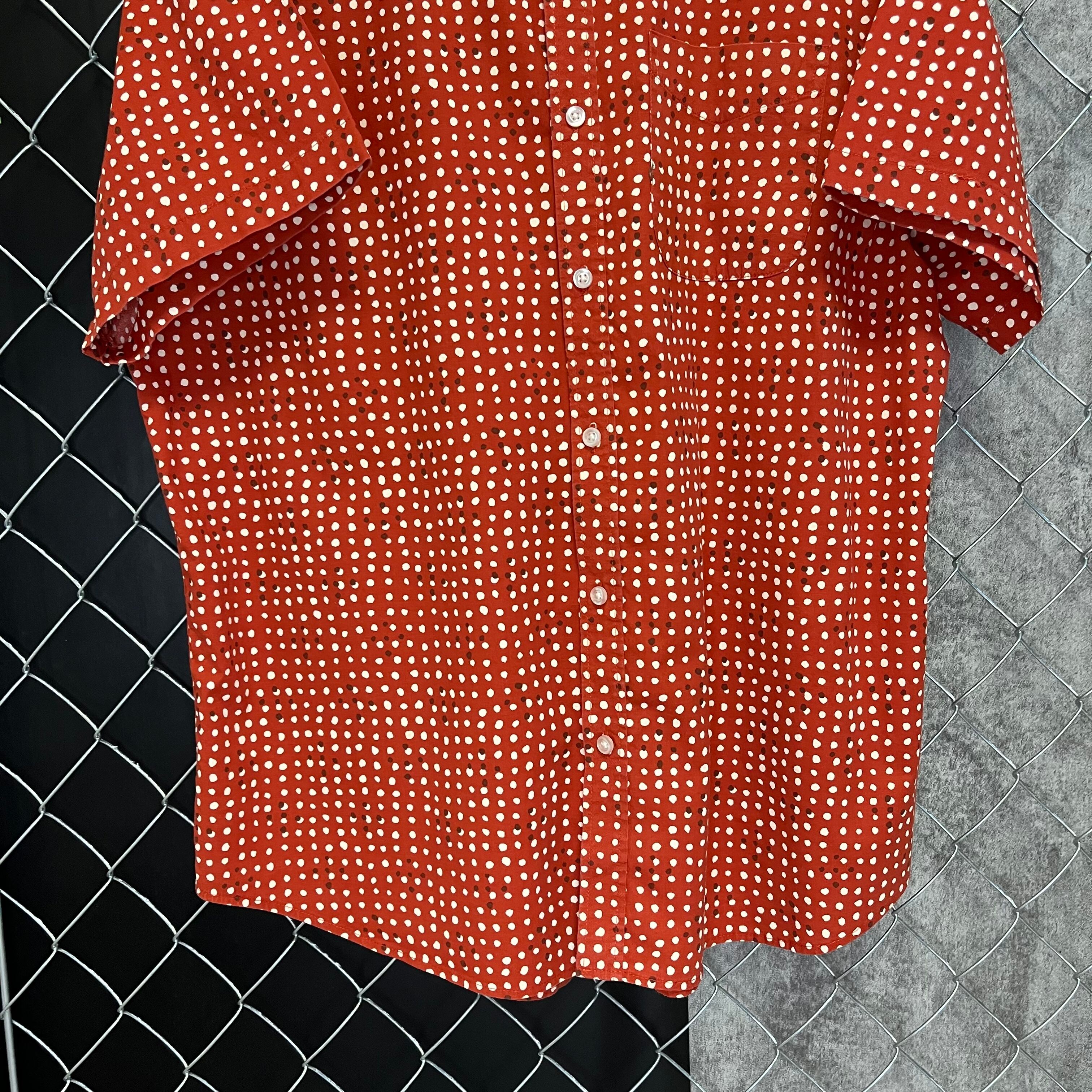 遠目でも目立つレッドの色目に、細かい2色のドットがあしらわれていて、個性的な一枚。