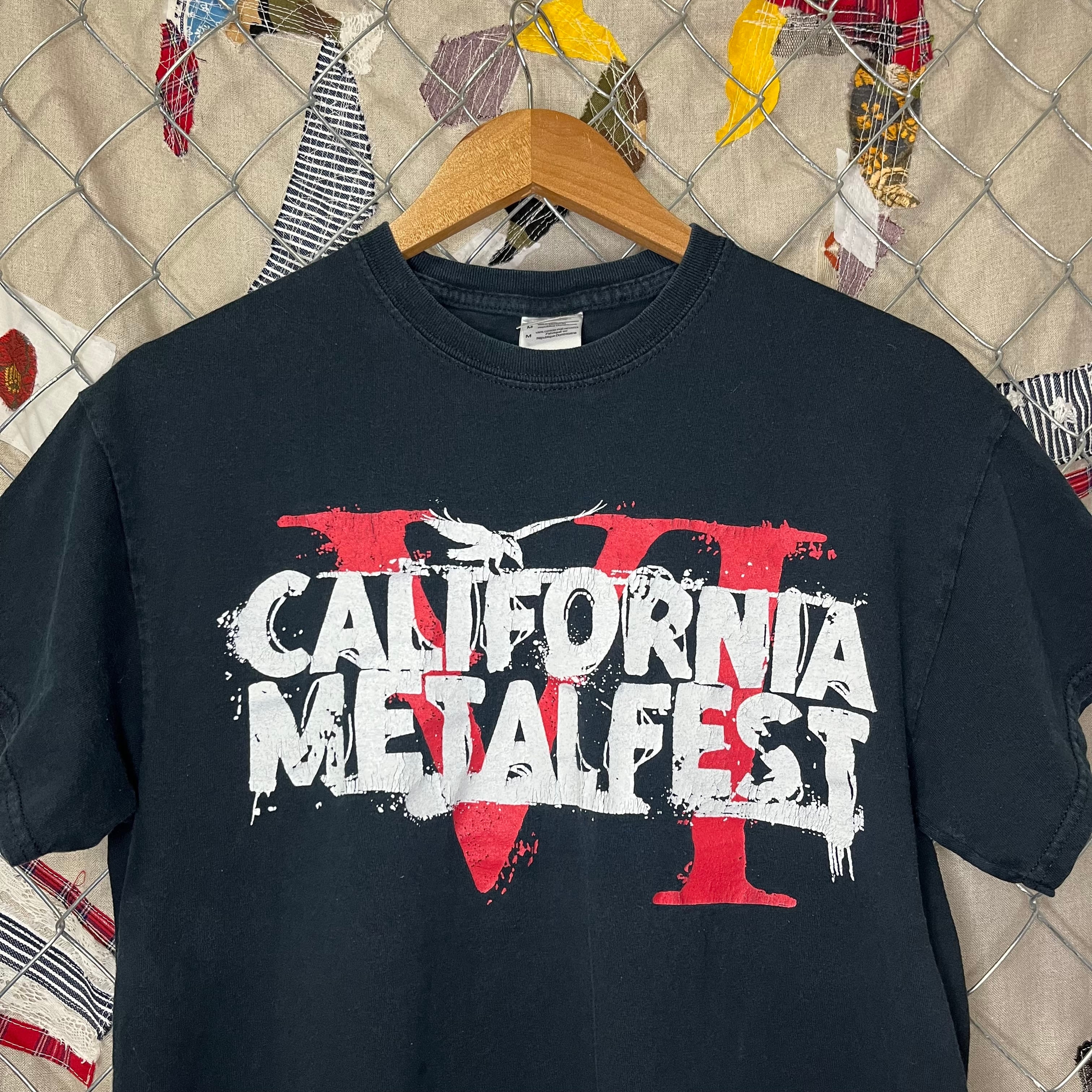 カリフォルニアメタルフェストIVのイベントTシャツで、バックには出演バンドのロゴがプリントされています。