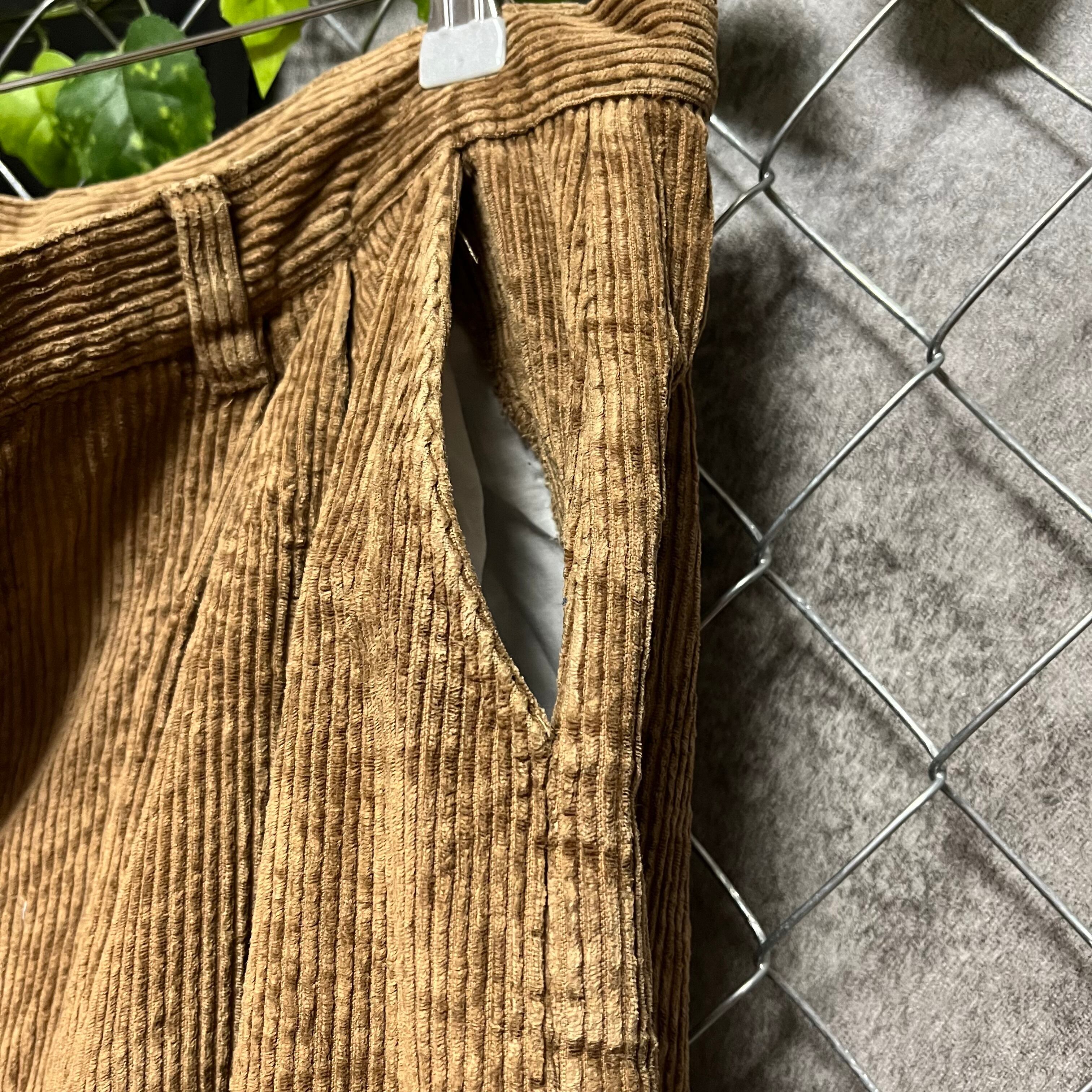 こちらの商品はCAROLINA BLUESのコーデュロイパンツです。ブロンズに近いブラウン系の色目に、コーデュロイ素材が優しい印象の一枚。色柄物とも合わせやすく、着回し力抜群のアイテムです(*^▽^*)